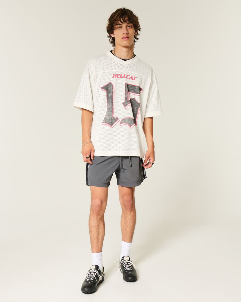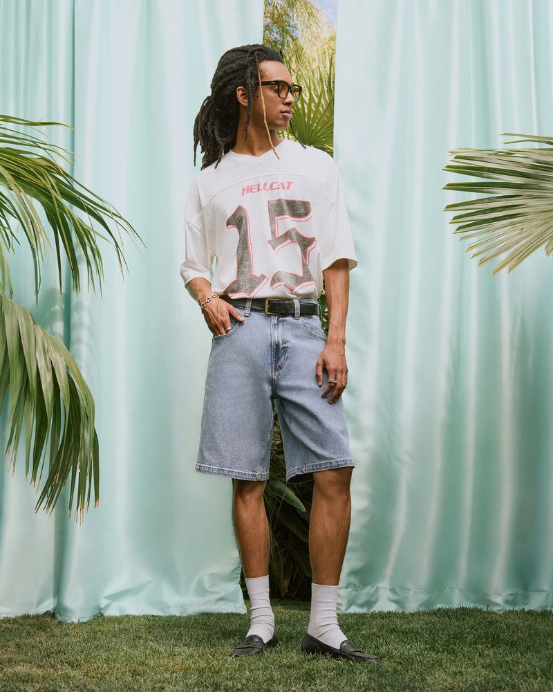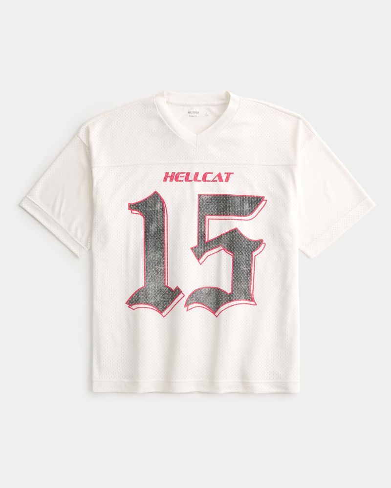 A classic football jersey in soft mesh fabric featuring official licensed Dodge Hellcat print graphics at the front and back. V-neckline, short sleeves. Baggy Fit. Imported.