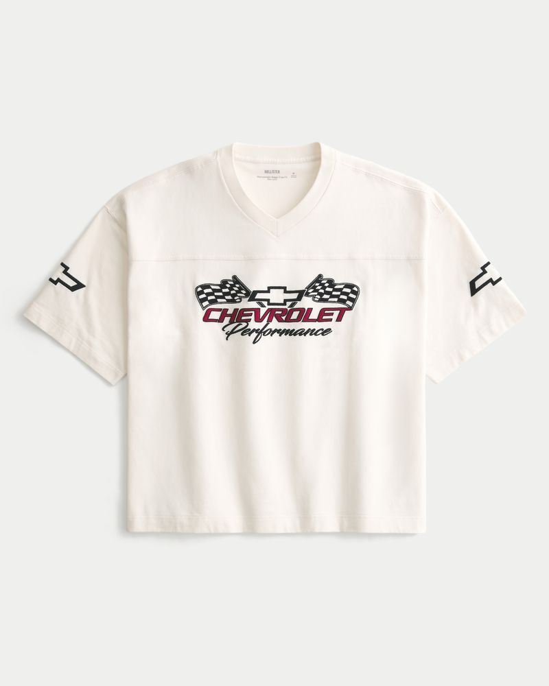 A super soft football tee in heavyweight cotton, featuring official licensed Chevrolet graphic embroidery. V-neckline, short sleeves. Baggy Crop Fit. Imported.