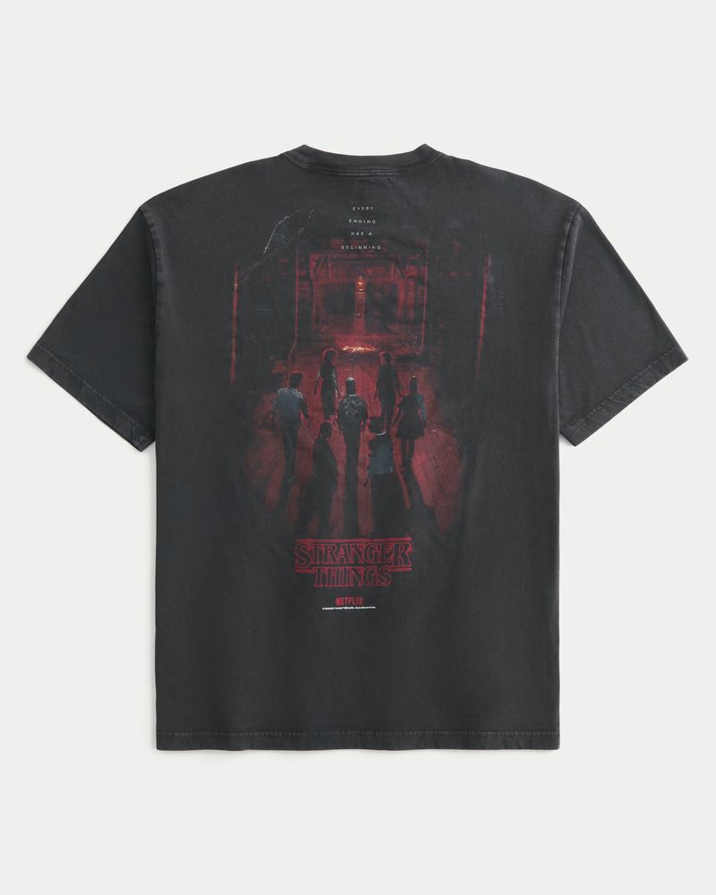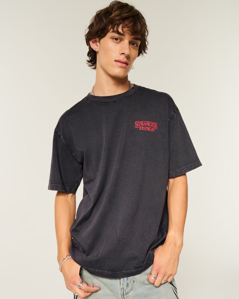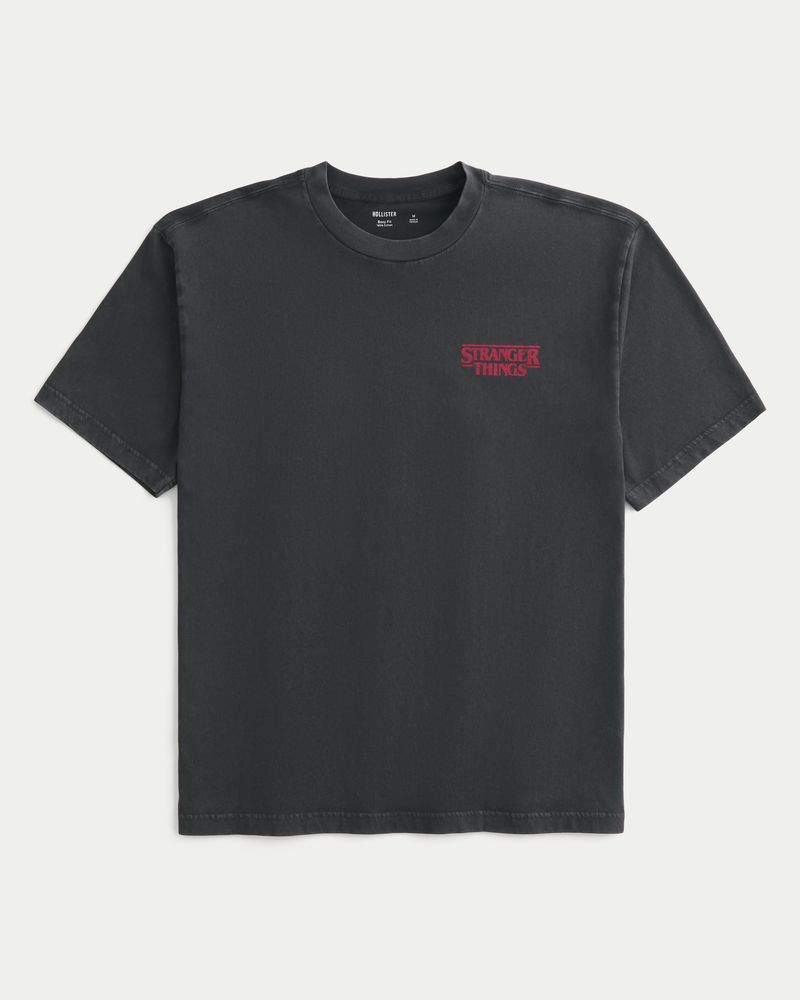 This super soft 100% cotton tee features official licensed Stranger Things print graphics at the left chest and back. Crew neckline, short sleeves. Boxy Fit. Imported.