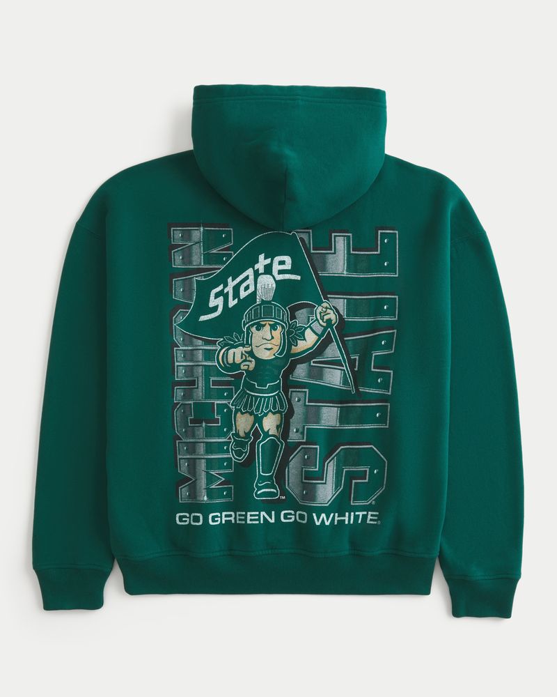 A super soft and comfortable fleece hoodie featuring official licensed Michigan State University print graphics at the left chest and back. Front pouch pocket, long sleeves, hood. Boxy Fit. Imported.