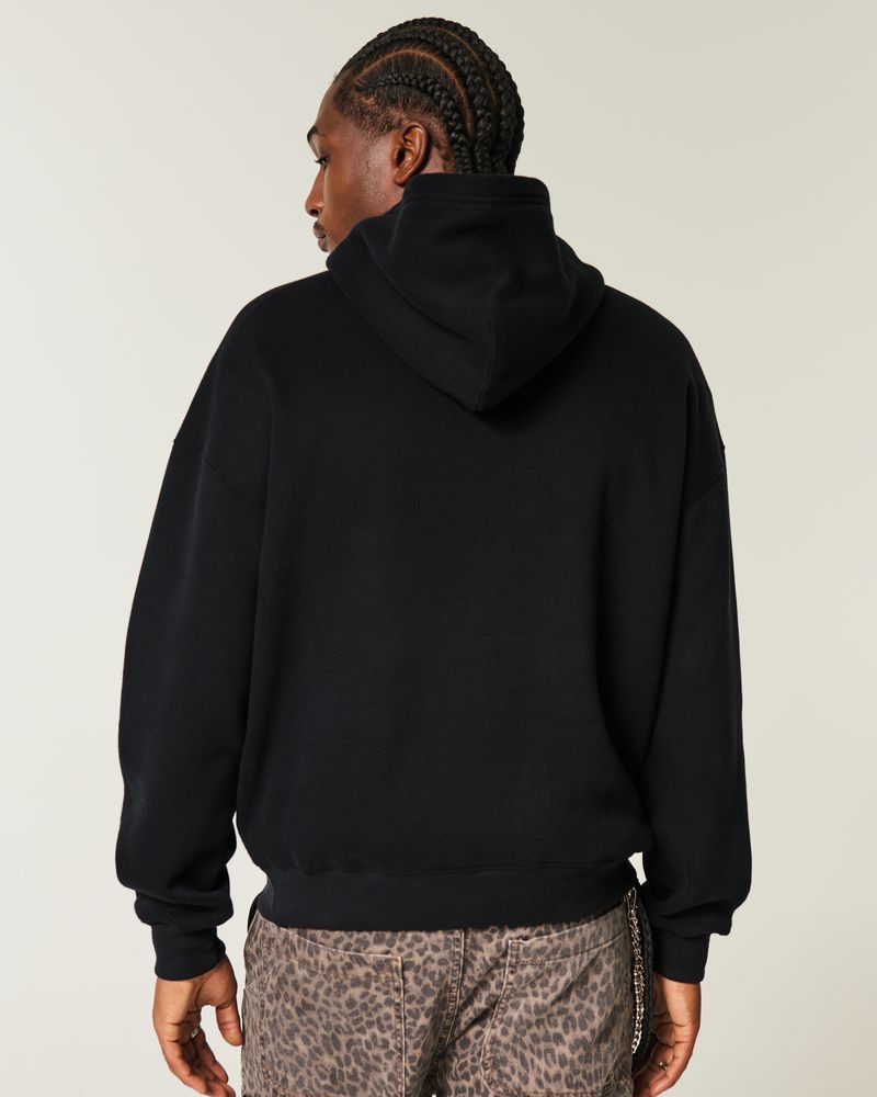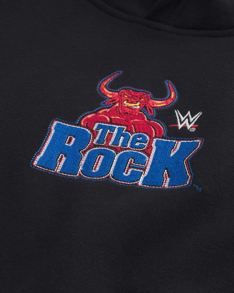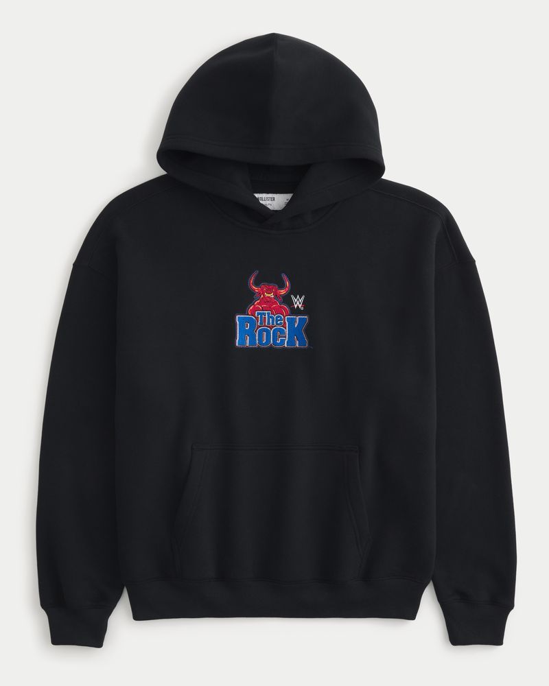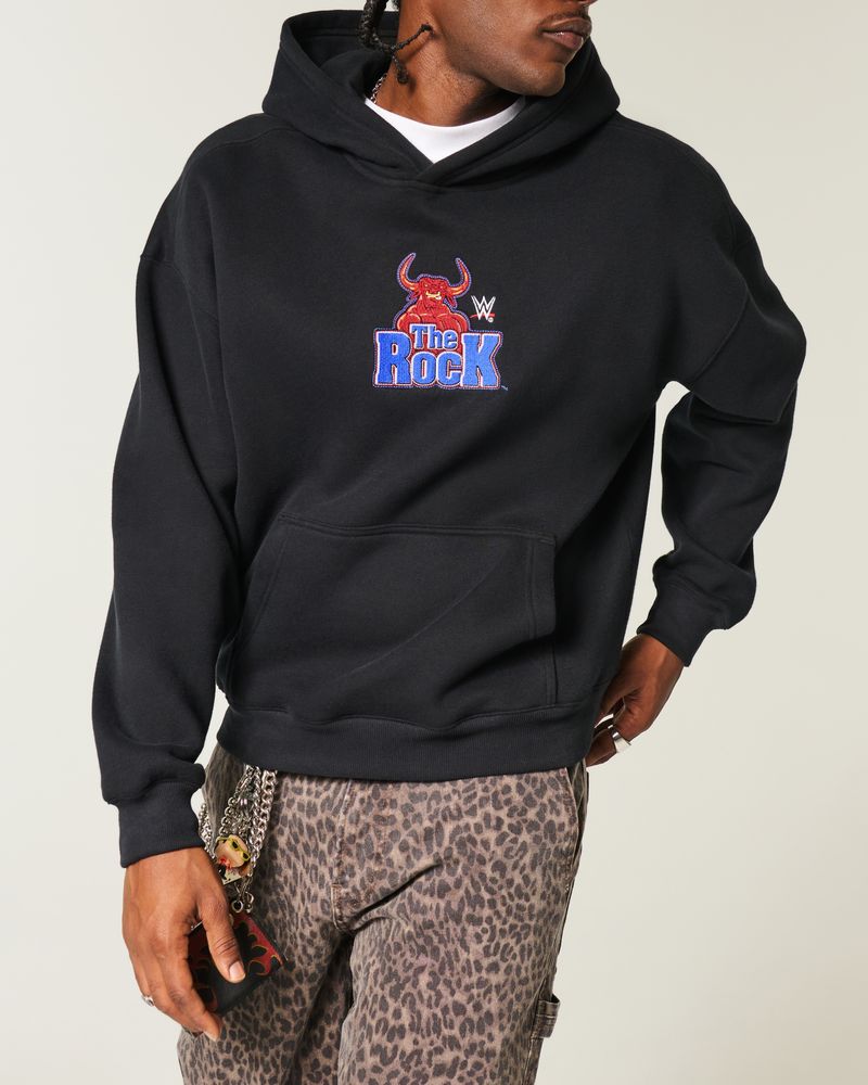 A super soft fleece hoodie featuring official licensed The Rock WWE graphic embroidery. Hood, front pouch pocket, long sleeves. Boxy Fit. Imported.