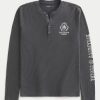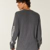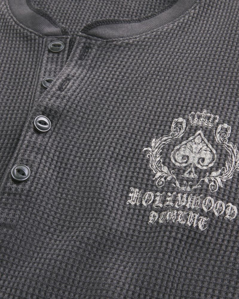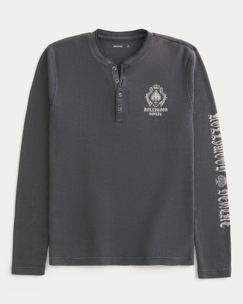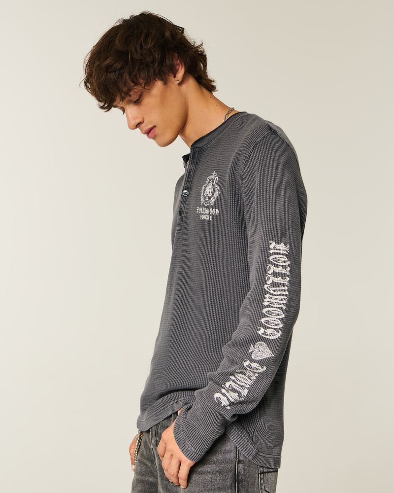 Made with super soft thermal waffle fabric, this Y2K-inspired henley features Hollywood print graphics at the left chest and left sleeve. Button placket, long sleeves. Imported.