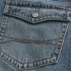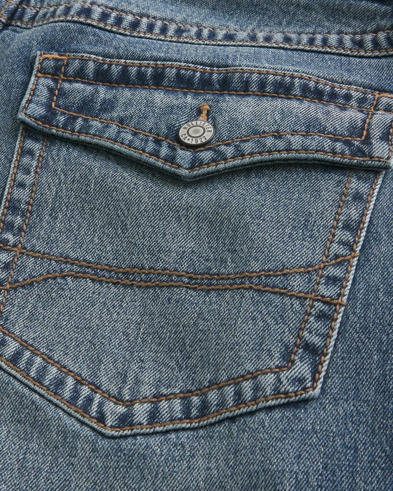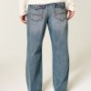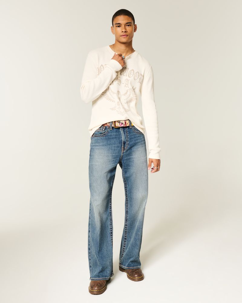 Comfortable denim jeans designed with a baggy leg and bootcut opening. Flap coin pocket, back flap pockets, medium wash with fading and whiskering. Imported.