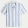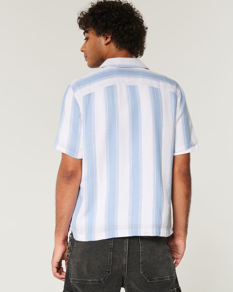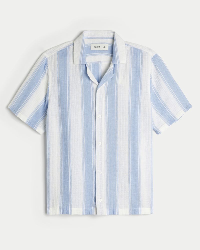 A classic button-through shirt in soft textural fabric with stripes. Collar, short sleeves, left chest pocket. Imported.