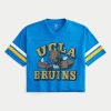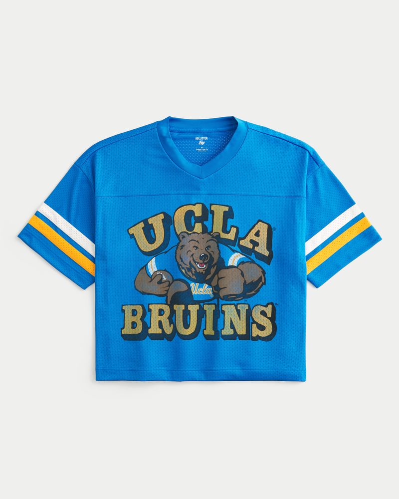 This classic football jersey is made with soft mesh fabric and features official licensed University of California, Los Angeles, UCLA print graphics. V-neckline, short sleeves. Baggy Crop Fit. Imported.