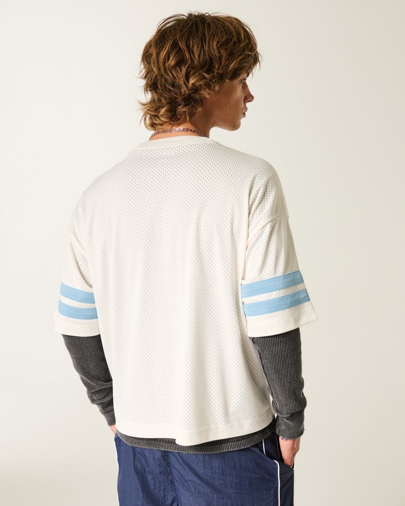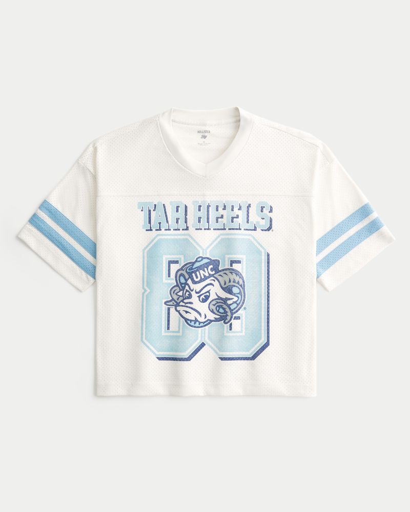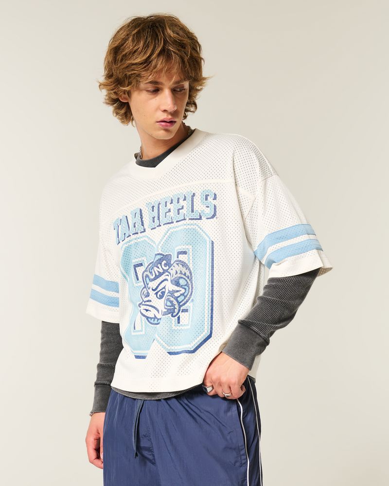 This classic football jersey is made with soft mesh fabric and features official licensed University of North Carolina at Chapel Hill print graphics. V-neckline, short sleeves. Baggy Crop Fit. Imported.