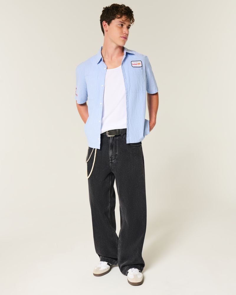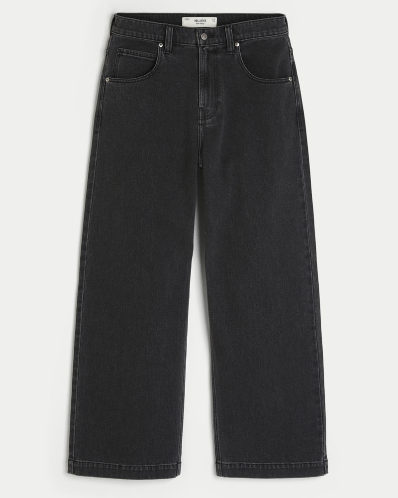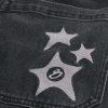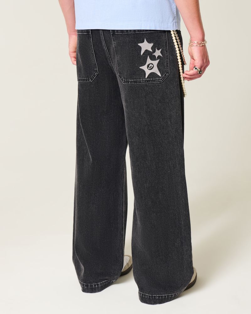 Comfortable denim jeans in washed black, designed with a super baggy leg. Embroidered star graphic at back pocket. Imported.