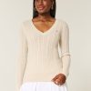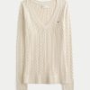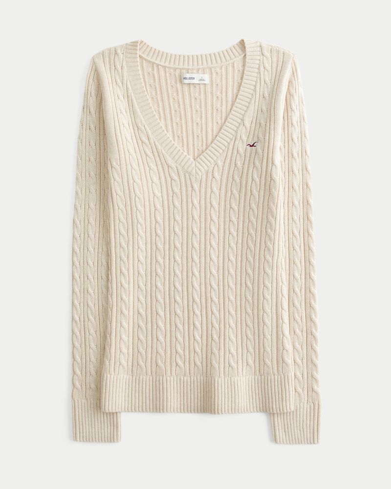 A super soft and cozy sweater with classic cable-knit patterns and an embroidered left chest logo icon. V-neckline, ribbed trims, longer length, long sleeves. Slim Fit. Imported.