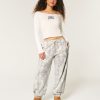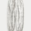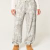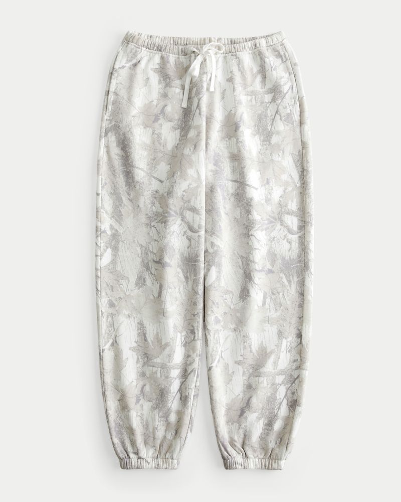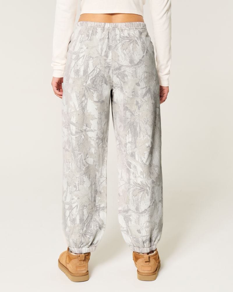 Super soft fleece joggers with a drawstring waist and all-over camo pattern. Banded hems, pockets, baggy leg. Imported.