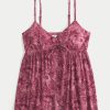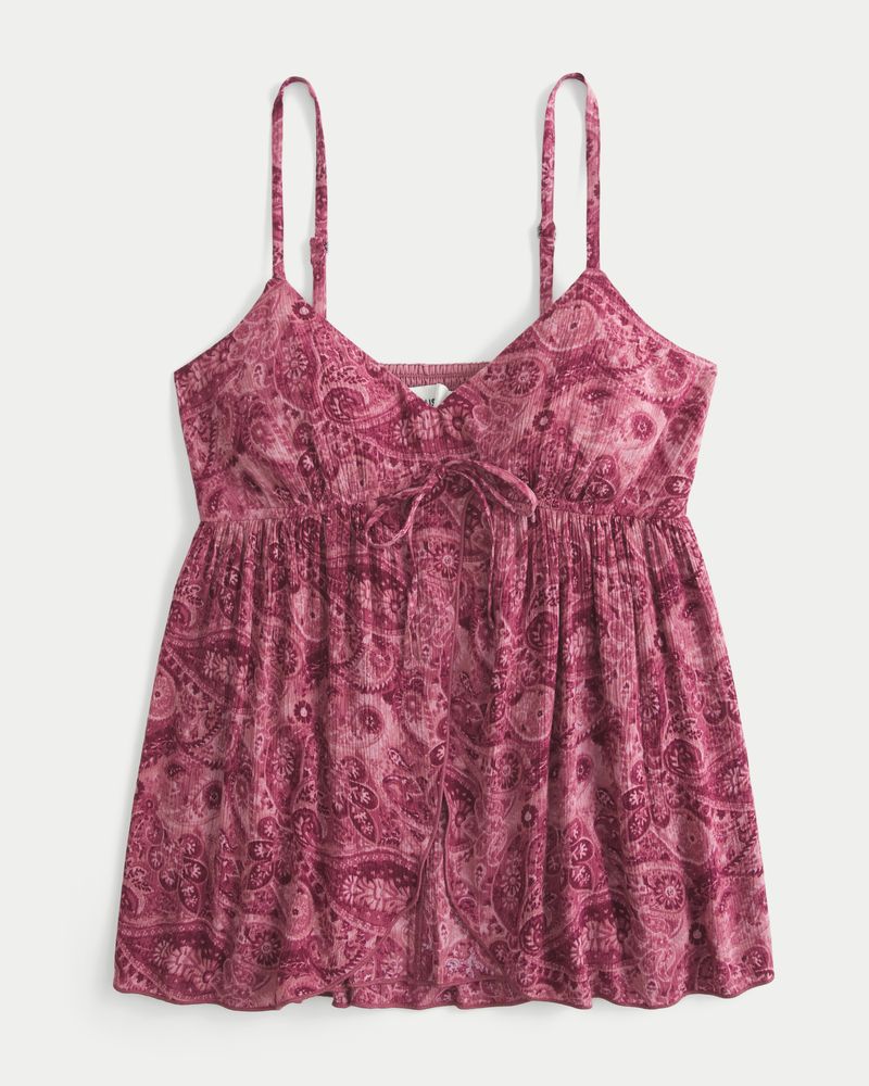 Flowy and super soft, this babydoll top is made with crinkle fabric and features an all-over pattern. Flyaway silhouette, adjustable straps, center tie detail. Imported.