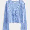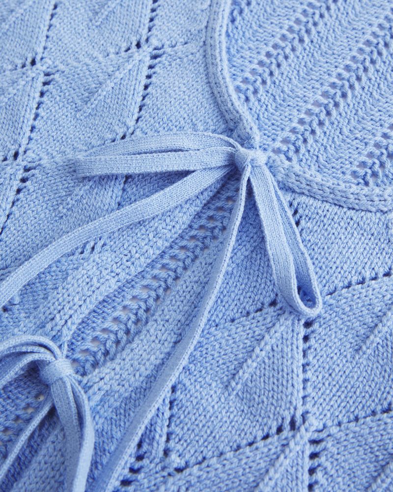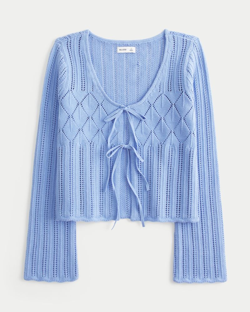 This super soft sweater features textured crochet-style fabric and a tie-front closure. Slim Fit. Imported.