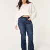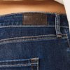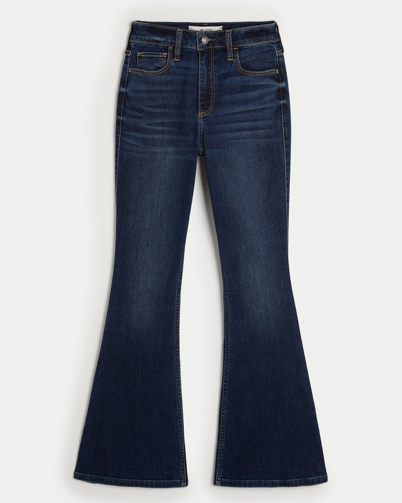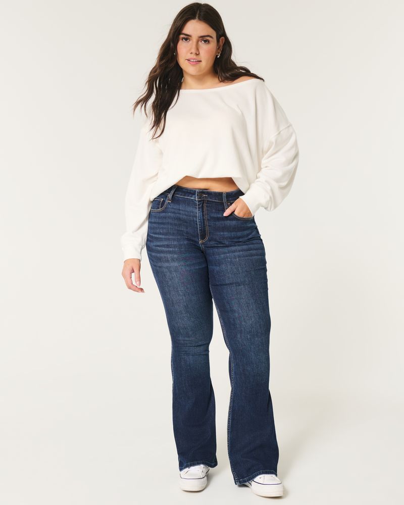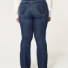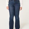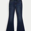 Designed with a high-rise waist, slim leg and flared hem. Dark wash denim with stretch, fading and whiskering. Imported.