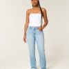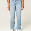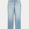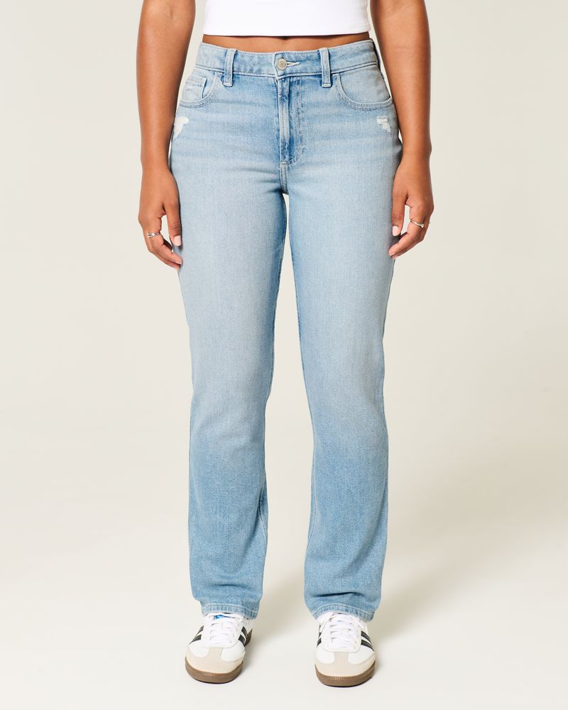 Comfortable denim jeans in a light wash, designed with flattering high-rise waist and straight leg. Vintage Stretch denim with fading, whiskering and distressed details. Imported.