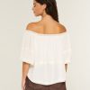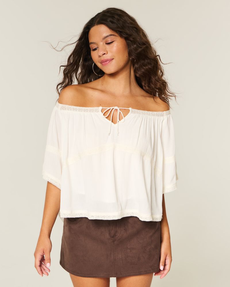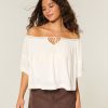 Flowy and super soft, this boho-inspired poncho top is made with crinkle fabric and features pretty lace detailing and a tie detail at the neckline. Short sleeves, looks perfect dressed up or down! Easy Fit. Imported.