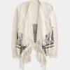 A pretty and super soft cardigan featuring a drapey collar with fringe detailing. No closure, ribbed trims, long sleeves. Easy Fit. Imported.