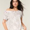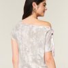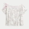 A super soft 100% cotton t-shirt with a pretty tie through the off-the-shoulder neckline. Short sleeves, all-over camo pattern. Easy Fit. Imported.