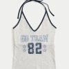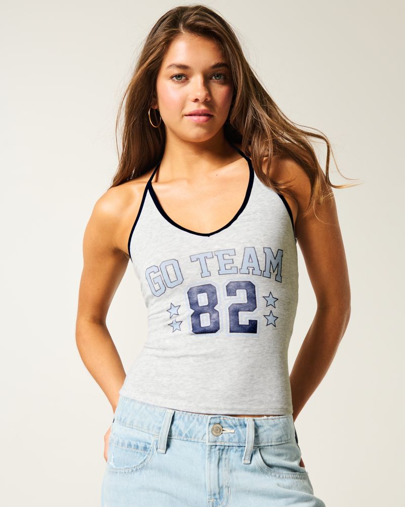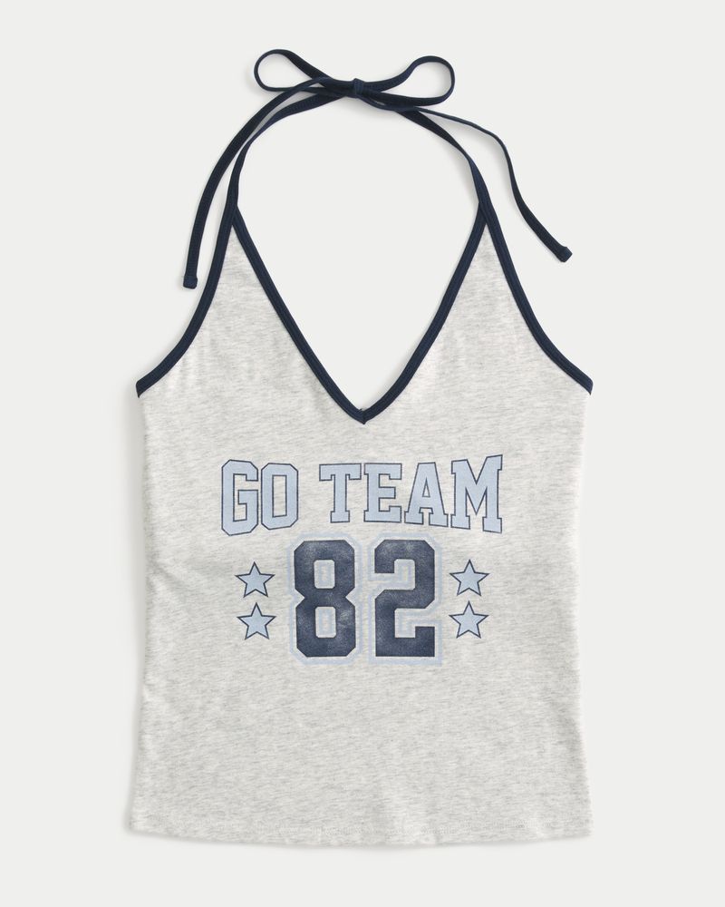 Cute and super soft, this top features a sporty Go Team print graphic. Halter straps, v-neckline. Slim Fit. Imported.