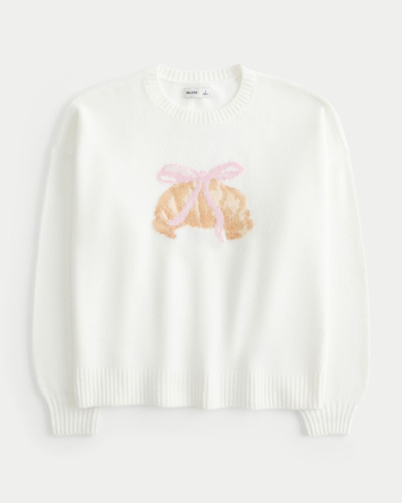 This super soft and cozy sweater features a cute croissant intarsia graphic, crew neckline and long sleeves. Ribbed trims. Imported.
