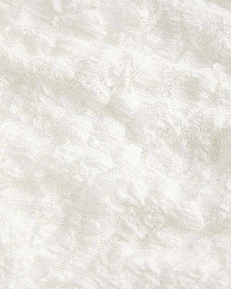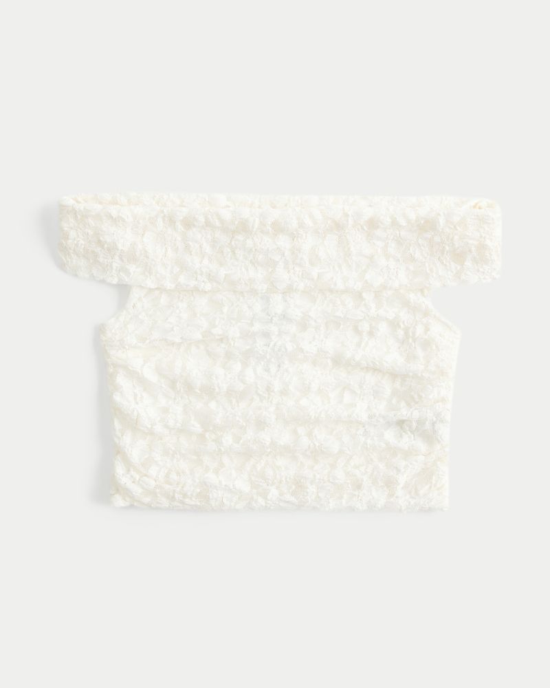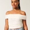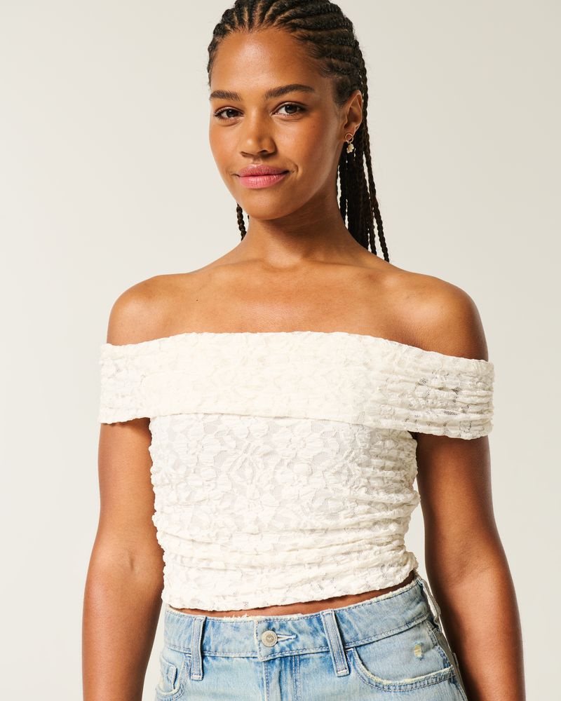 This pretty and super soft top features all-over lace detailing and a foldover off-the-shoulder neckline. Ruched detailing at the side seams, double-lined. Slim Fit. Imported.