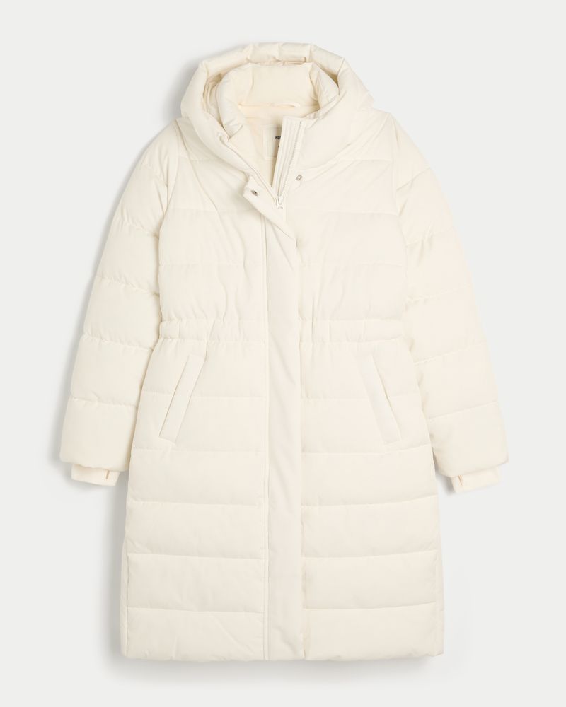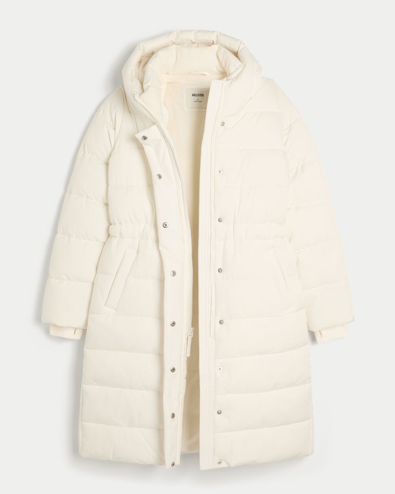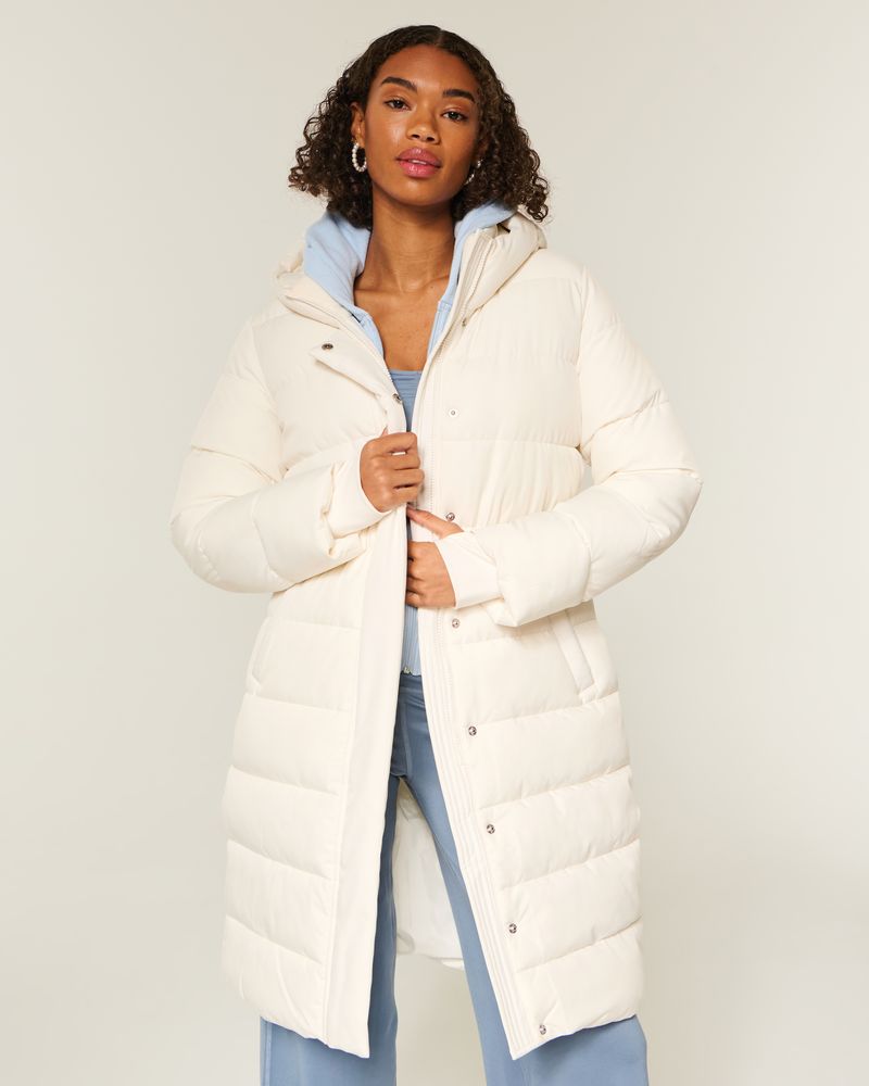 This cozy longline puffer parka features quilted channels and wind and water-resistant fabric. Soft jersey storm cuffs with thumb openings, interior pocket, front pockets with snap closure, hood, cozy lining, full zip-up closure with snaps, longer length, interior bungee cord. Imported.
