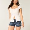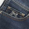 Comfy denim shortie shorts in a dark wash, featuring pretty floral embroidery and an embroidered bow detail at the right coin pocket. Low-rise waist, fading, whiskering. Imported.