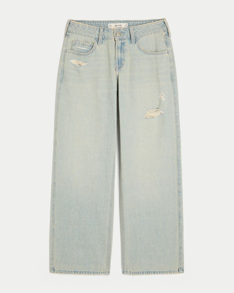 Comfortable denim jeans designed with a low-rise waist and baggy leg. Light wash with fading, whiskering and distressed details. Imported.
