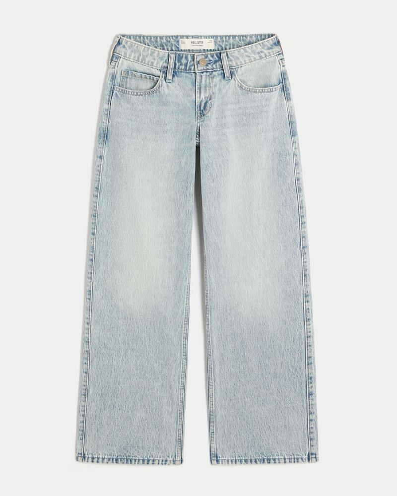 Cute and comfortable denim jeans in a light wash, designed with a low-rise waist and baggy leg. Fading, whiskering. Imported.