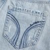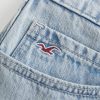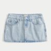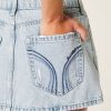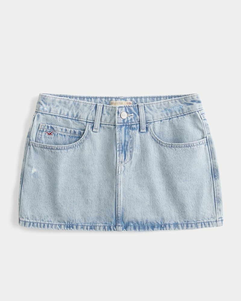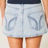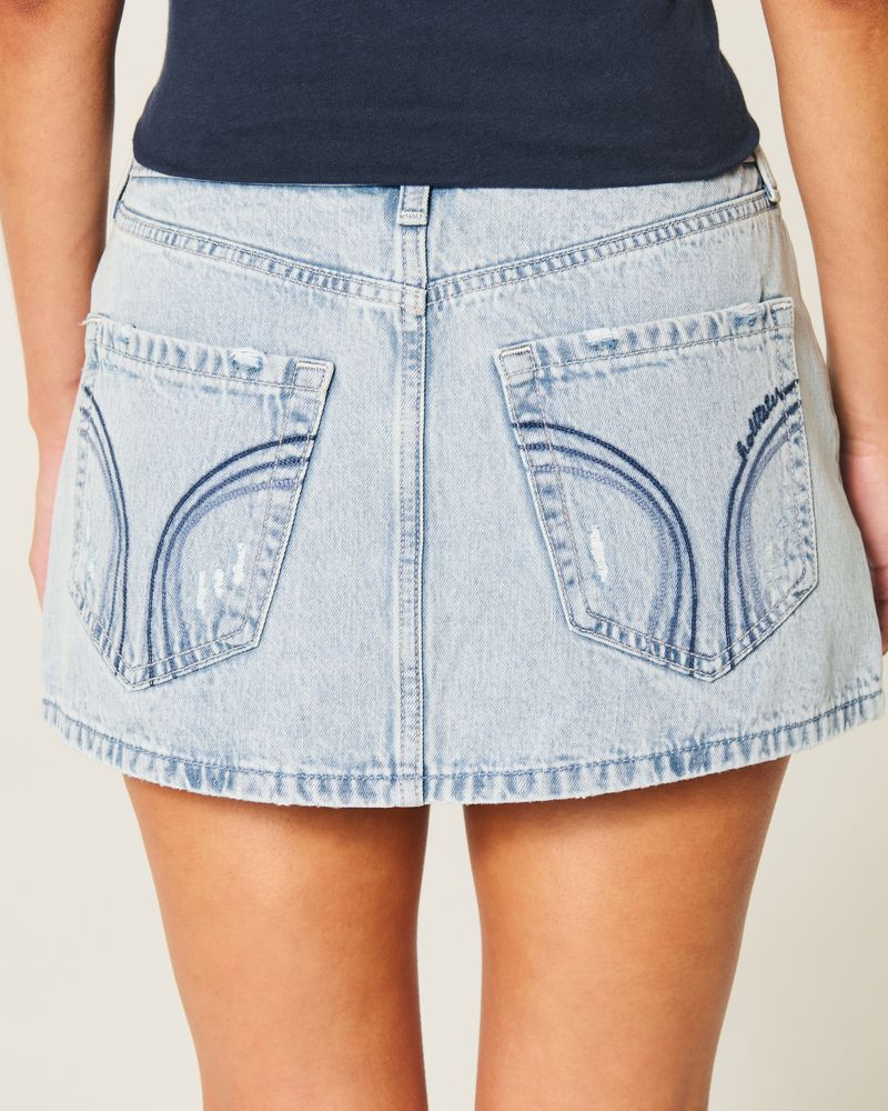 A cute denim mini skort in a light wash, designed with a low-rise waist and built-in shorts with a phone pocket. Imported.