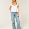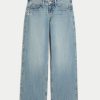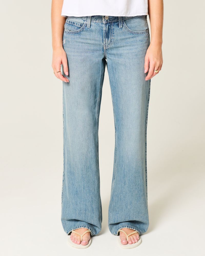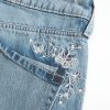 Comfortable denim jeans in a medium wash, designed with a baggy leg and flattering low-rise waist. Embroidered butterfly graphics at right side and back pocket. Foldover back pocket detail, fading, whiskering. Imported.
