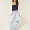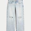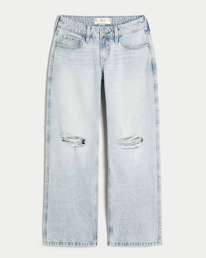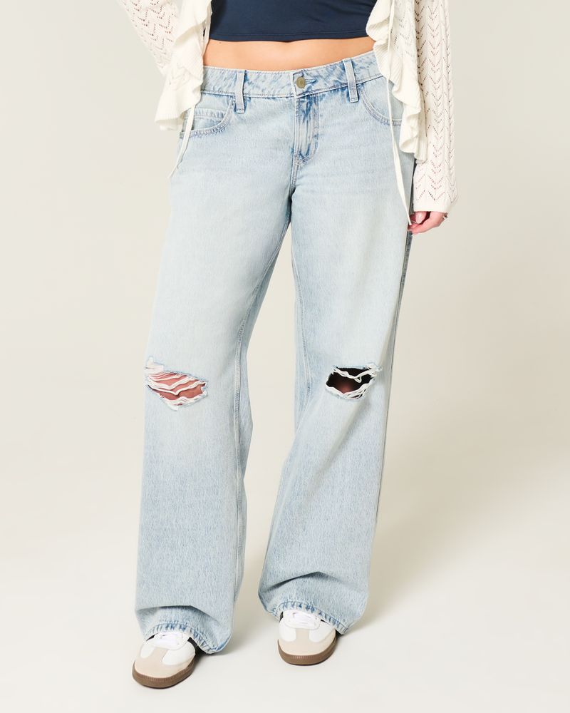 Comfortable denim jeans in a light wash, designed with a baggy leg and flattering low-rise waist. Fading, whiskering, ripped details. Imported.