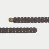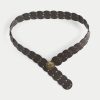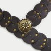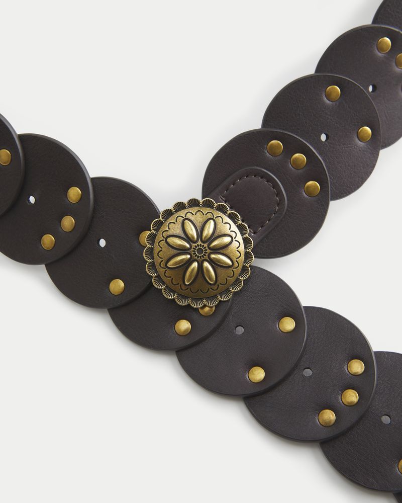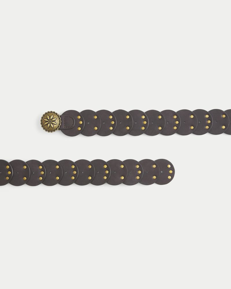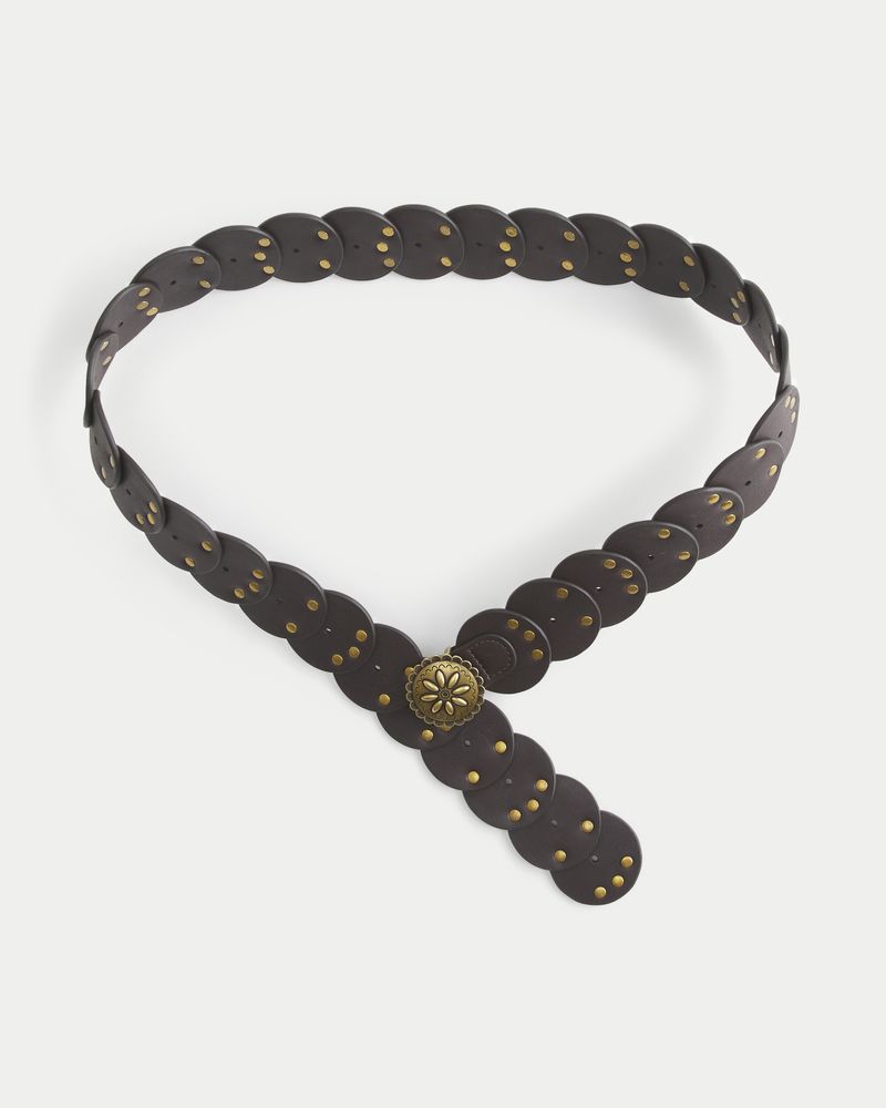 This cute faux leather belt features metal stud details and a pretty metal medallion. Adjustable. Imported.