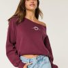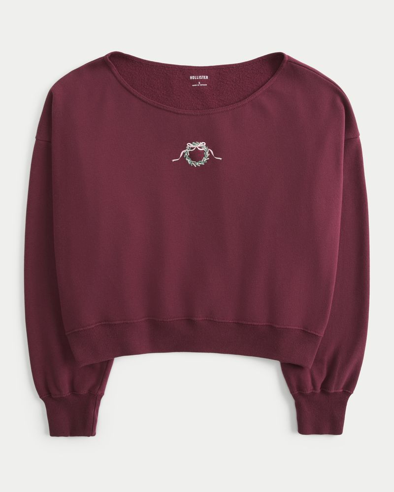 This cozy and super soft fleece sweatshirt features an embroidered wreath graphic and an off-the-shoulder neckline. Long sleeves, mini silhouette. Imported.