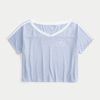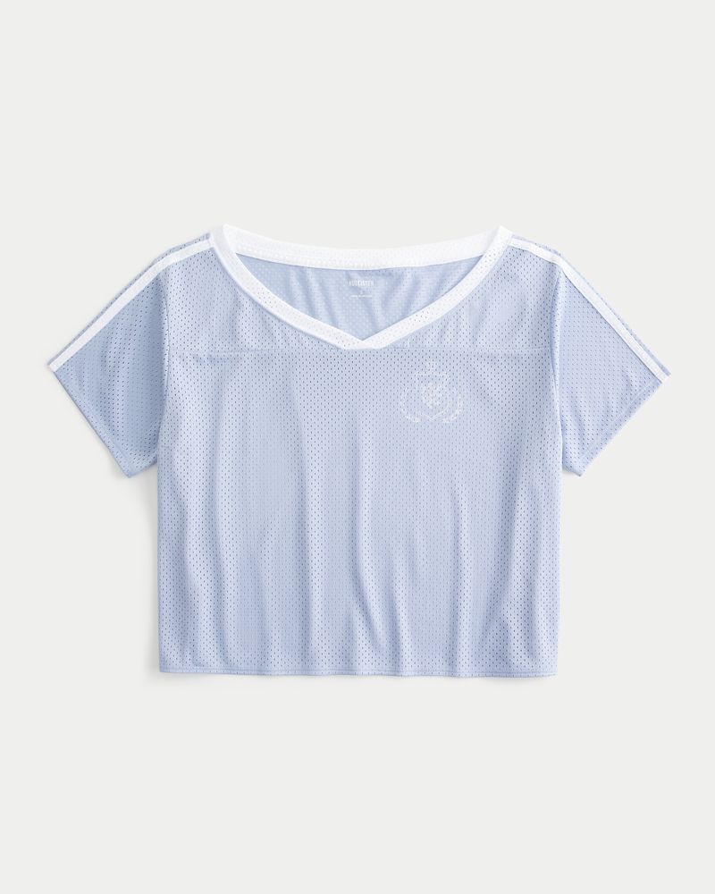 A soft mesh jersey-style top with an off-the-shoulder v-neckline and left chest print emblem. Short sleeves. Oversized Fit. Imported.