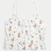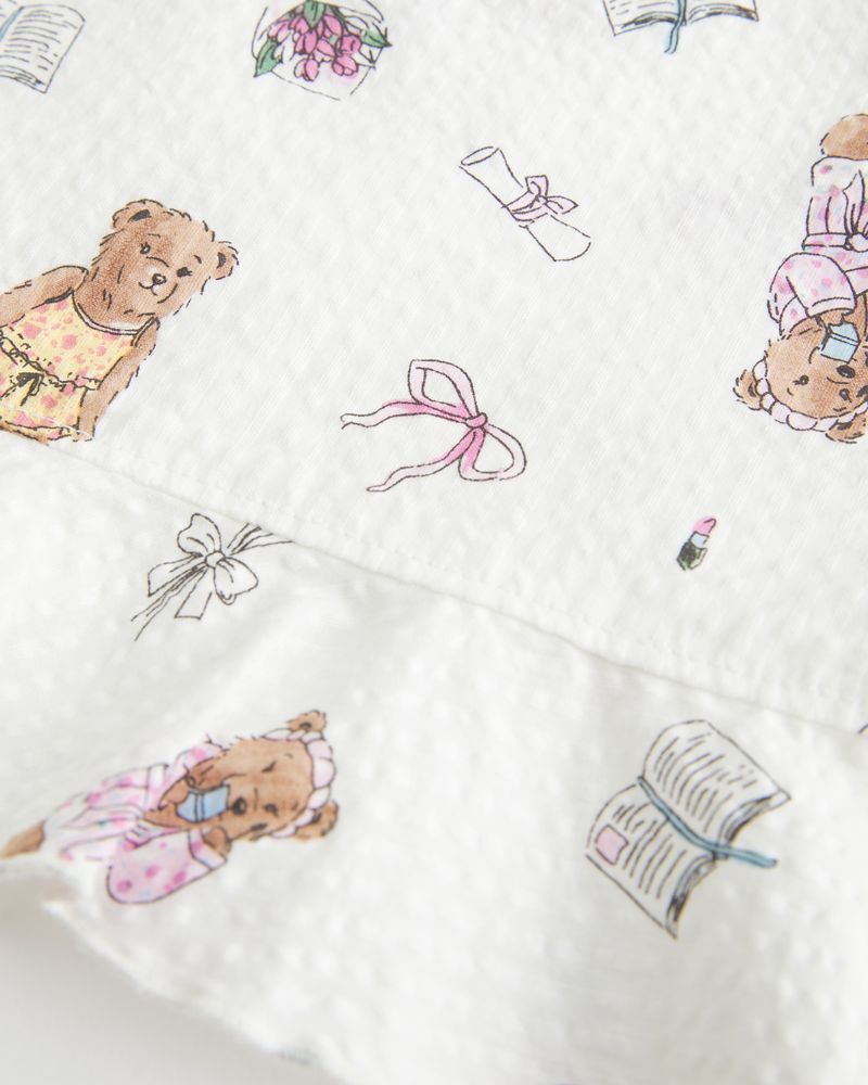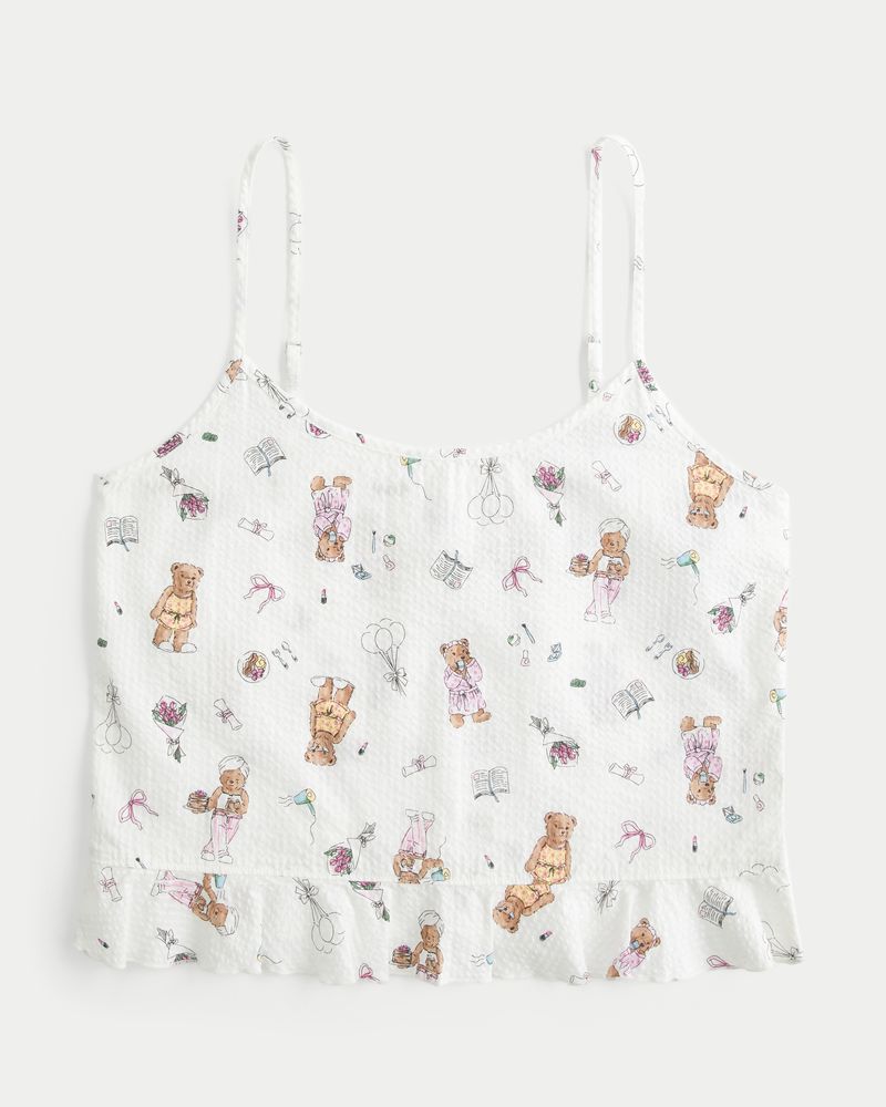A cute and comfy tank in soft seersucker fabric, featuring an all-over bear graphic pattern and ruffled hem. Adjustable straps. Imported.