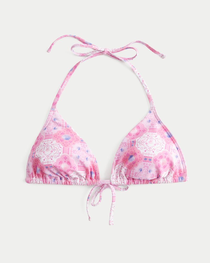 This cute triangle bikini top features a tie closure and a spring-break-inspired pattern. Soft swim fabric, removable padding. Imported.