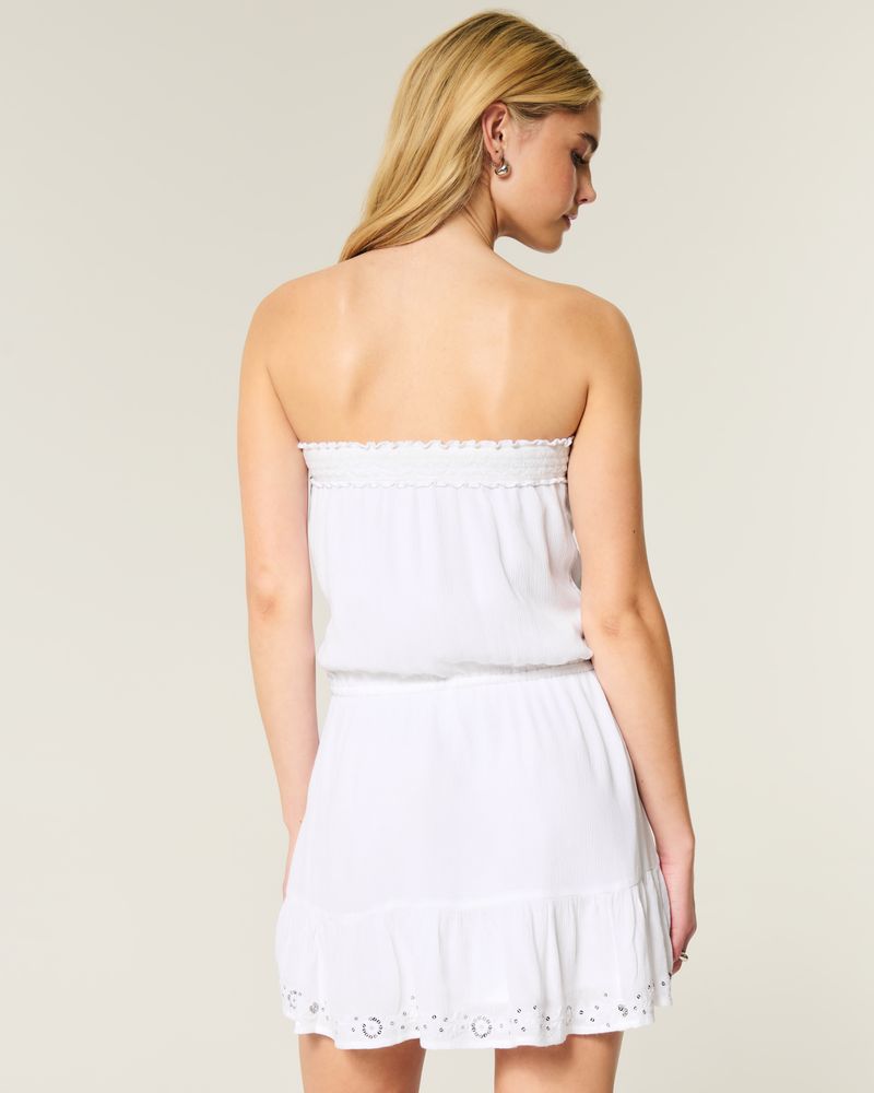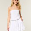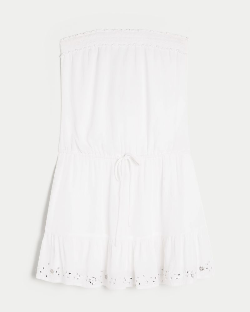 Pretty and super soft, this blouson mini dress features a drawstring waist and shine details at the hem. Strapless, soft banded neckline. Imported.