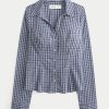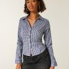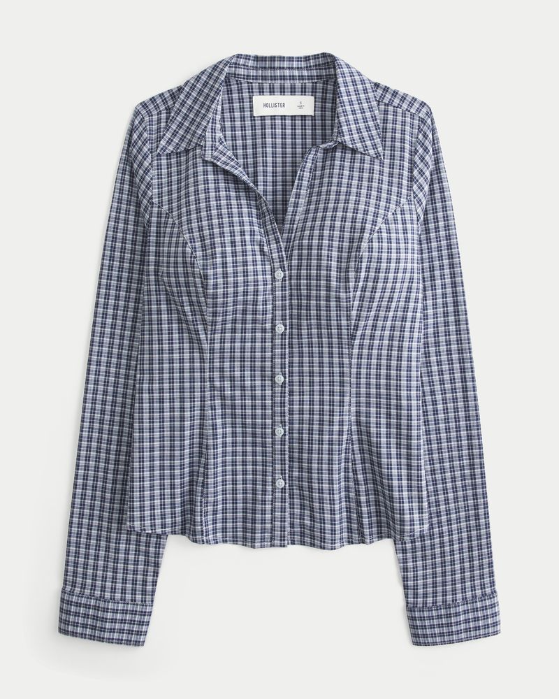 A Y2K-inspired, slim-fitting long-sleeve stretch poplin shirt with a collar, seaming, and adjustable back tie. Full button closure. Slim Fit. Imported.