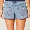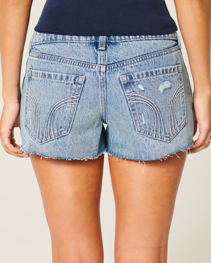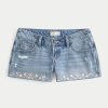 Cute and comfy denim mini shorts designed with an ultra low-rise waist. Distressed detailing, fading, whiskering, embroidered floral details at hems. Imported.