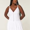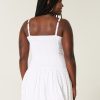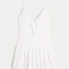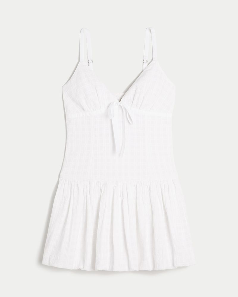 A super soft and pretty v-neck mini dress with a bubble hem, adjustable skinny straps and drop waist. Pretty tie detail, pockets, built-in shorts. Imported.